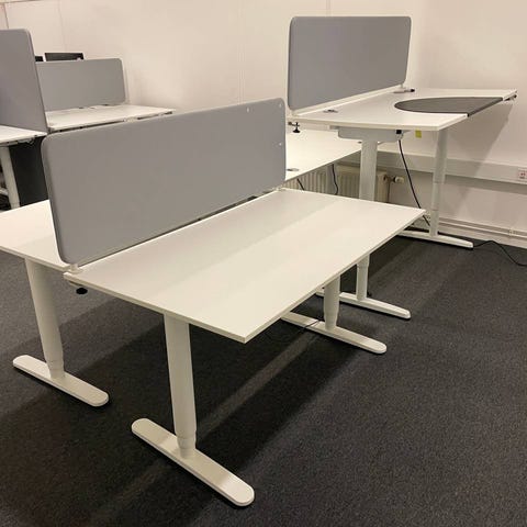 Komplett kontorsarbetsplats bestående av höj- och sänkbart skrivbord med kabelgenomföring samt tygklädd bordsskärm. Perfekt för kontor eller hemmakontor. Stabil konstruktion och i gott skick.