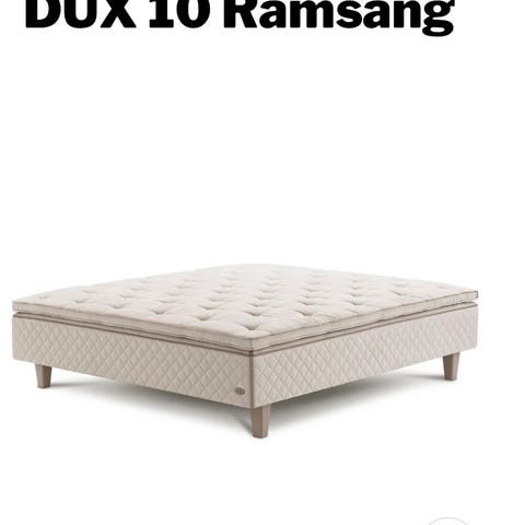 DUX madrass i grått tyg med quiltat mönster och kontrasterande kantband. Madrassen har ett överdrag med DUX-logotyp i mönstret. Passar i sovrum eller gästrum. Hårdhet medium. Med bäddmadrass och ben i bok.