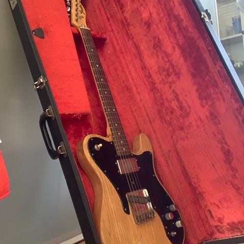 Telecaster av modellen ”Elite”. Inga större skador. Moddad med pickup från Seymour Duncan för Nashville-setup. Original plektrumskydd och elektronik medföljer, liksom även hard case.
