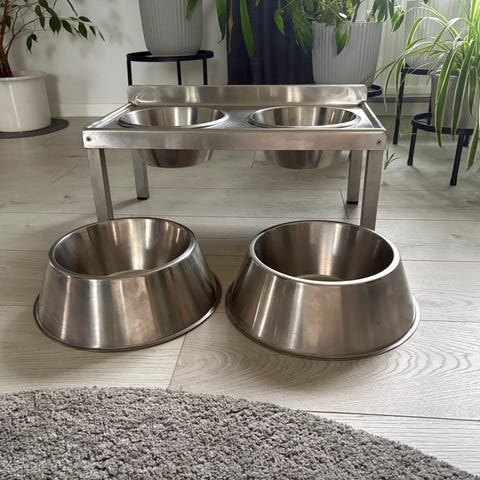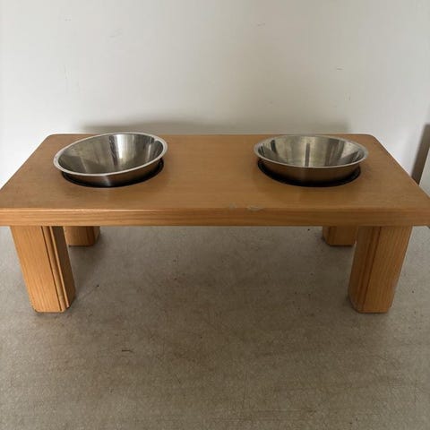 Dubbel matskål för husdjur med två vita skålar i keramik placerade i ett avlångt ställ av trä. Passar för servering av både mat och vatten till din hund. Skålarna är löstagbara från stället, vilket underlättar rengöring och påfyllning. Säljer då vi köpte inför att vi skulle köpa hund men då det inte blev av har den blivit kvar här hemma. Hör av er om ni har frågor, Mvh