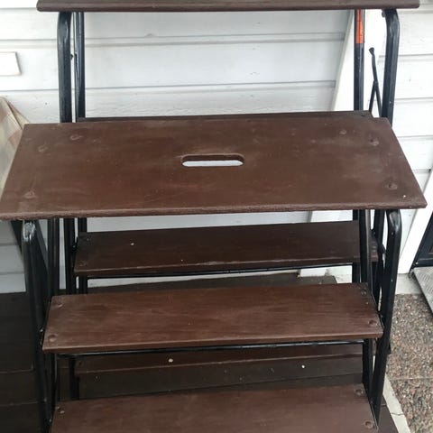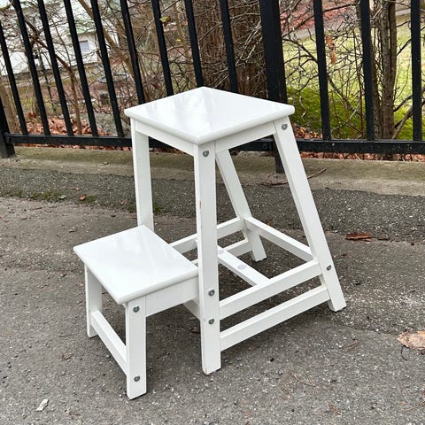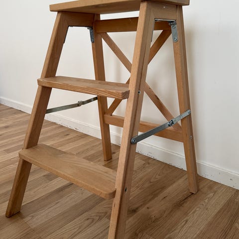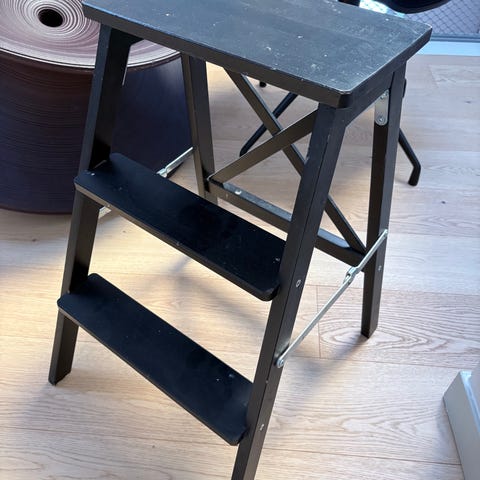Pallstege i svart plast med två steg. Passar för användning inomhus, till exempel i kök, förråd eller andra utrymmen där extra höjd behövs för att nå hyllor eller skåp. Stabil konstruktion med breda steg för ståyta.