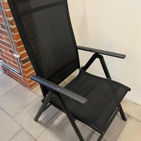 Solstol i reclinermodell i grått tyg med svart metallstomme. Stolen har ställbar rygg och fotdel, integrerad nackkudde samt armstöd i plast. Sits och rygg är upphängda med elastiska snoddar mot ramen. Lämplig för uteplats, altan eller trädgård.