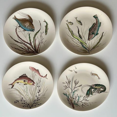 Fyra fina skaldjurstallrikar med olika motiv samt en skål i nyskick. Från engelska märket Seafare, Johnson Bros.
