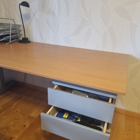 Skrivbord i gott skick. Det finns en liten skada på sidan mot väggen. Benen kan justeras i höjd.