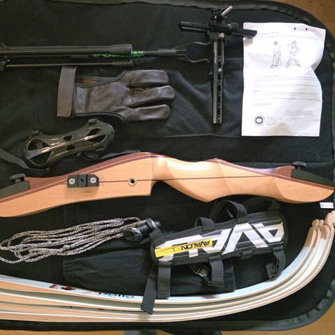 Många av de små accessoarerna: avståndsmätare till strängen, pilutdragaren, sling, bågsträngare och plunger har fortfarande förpackningen de kom i.