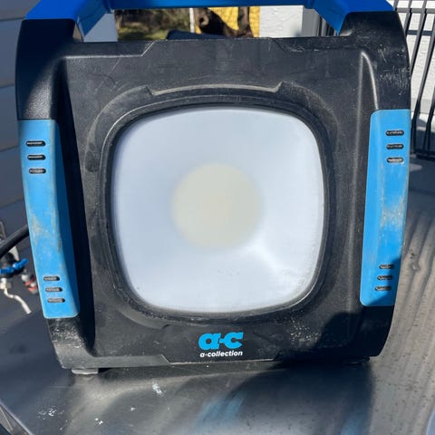 Arbetslampa på stativ. Lampan är monterad på ett trebensstativ och ansluts med sladd till eluttag.