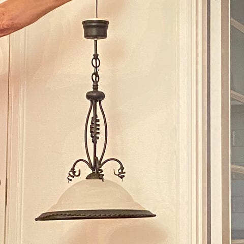 Stomme i , 1 stor kupa i mitten i slipat och frostat glas med vindruvor motiv diametern 40 cm och 3 mindre kupor runtomkring stomme bredd med räkning med mindre kupor 60 cm. Längd kedjan 50 cm total höja höjd ca. 70cm.