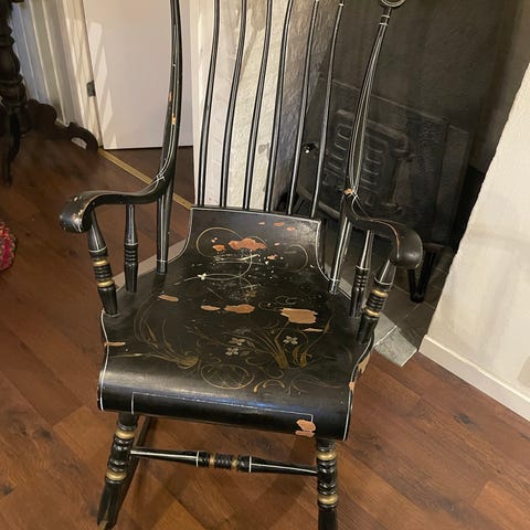 Väldigt fin gungstol i trä från sekelskiftet med svart lackerad yta och handmålad blomdekor i ljusa och gröna toner. Stolen har hög rygg med spjälor, armstöd och svängda medar. Sitsen är formad för att ge stöd och är dekorerad med ornamentalt mönster. Passar som sittmöbel i vardagsrum, sovrum eller läshörna.