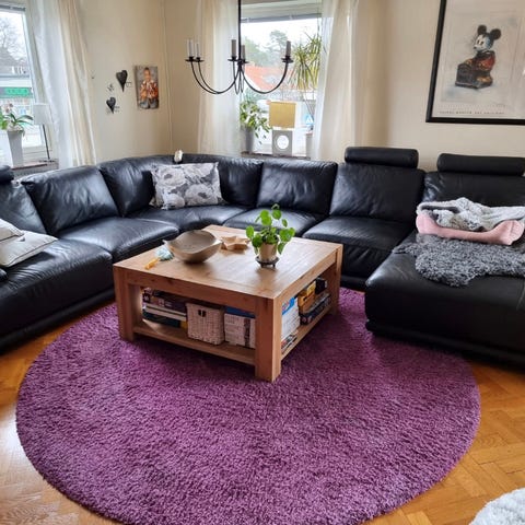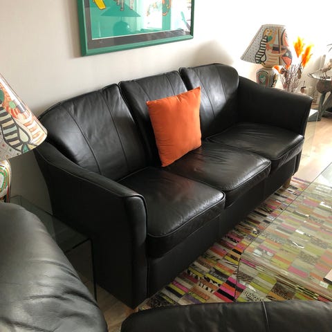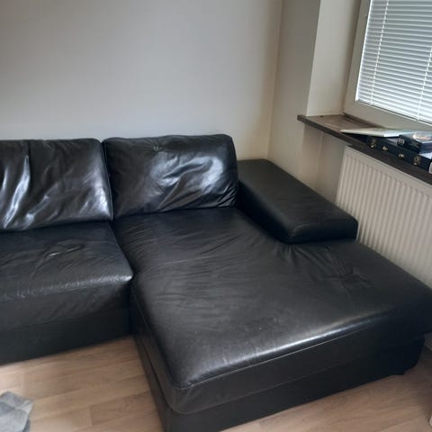 Jag har en svart skinnsoffa som är bekväm och prisvärd. Soffan är i bra skick förutom slitage på båda armstödet. Se bild nummer tre.