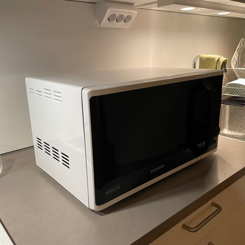 Samsung mikrovågsugn i svart utförande. Fristående modell med digital display, vred och knappar på sidan för enkel inställning av effekt och tid. Invändig roterande tallrik i glas. Passar för uppvärmning och tillagning av mat i kök eller pentry.