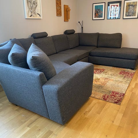 Säljer vår modulsoffa. Varje modul är 1x1m, ryggstöden är lätt avtagbara. Skjut ihop och lägg på bäddmadrass så har ni en gästsäng. Mindre tygskada under ett av ryggstöden men inget som syns. Skön att sjunka ner i för vila eller titta på tv. Kuddarna medföljer ej.