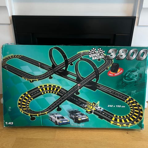 Ninco Speedway bilbana med två formelbilar. Setet innehåller raksträckor, kurvor, rälsdelar med bommar, styrhandtag, strömadapter och två formelbilar i olika färger. Banan kan byggas som en oval enligt förslag på kartongen och är avsedd för eldriven slotracing i mindre skala för inomhusbruk.