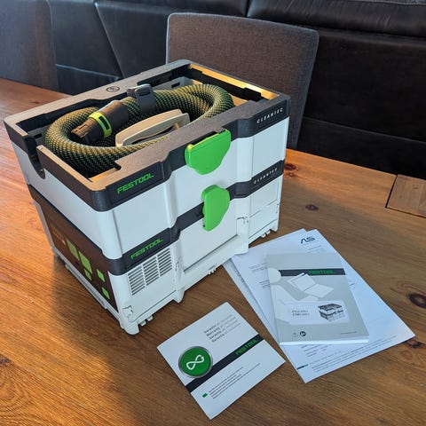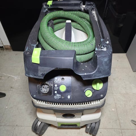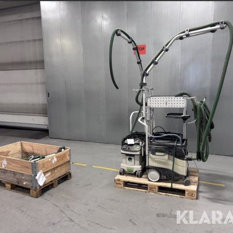 Festool CT 22 E grovdammsugare med slang. Mobil dammsugare för bygg- och verkstadsarbete, utrustad med stora bakhjul och svängbara framhjul för enkel förflyttning. På ovansidan finns hållare för slang. Frontpanel med reglage för sugstyrka och anslutning för slang. Avsedd för uppsamling av damm och smuts vid elverktyg och rengöring av arbetsplats.