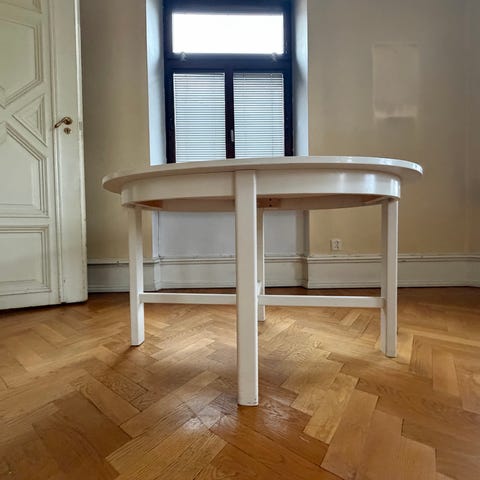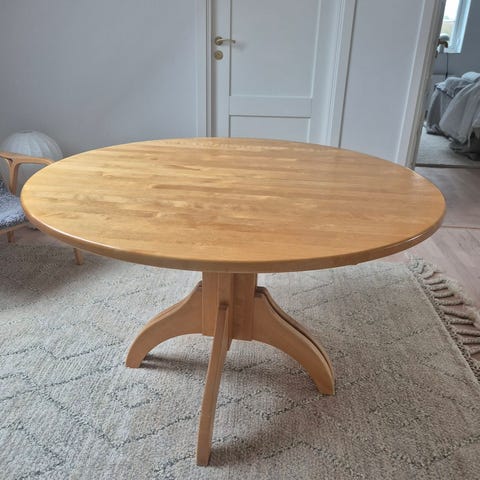 Säljer detta matbord i valnöt från 1950/60-tal, bordet är i fint skick och har endast mindre åldersrelaterade märken. Mycket fint i sin helhet. Bordet går att dela på mitten där 2 skivor á 45 cm får plats. Skivorna är i toppskick och är något mörkare då de knappt använts. Benen går inte att ta av.