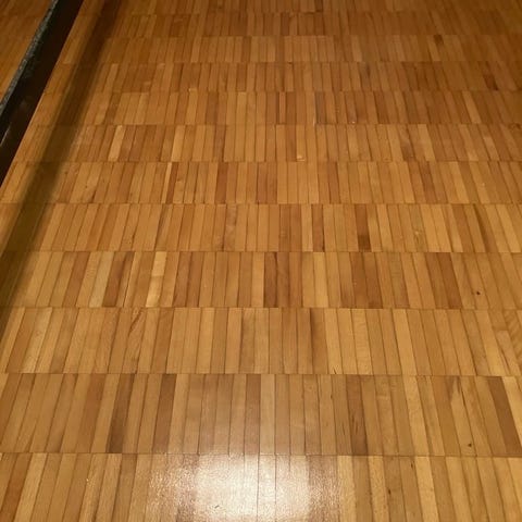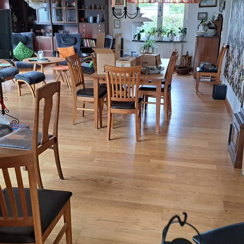 Trots detta är det ett massivt och stabilt golv som passar bra för limning och kan bli mycket fint efter omslipning och ny ytbehandling.