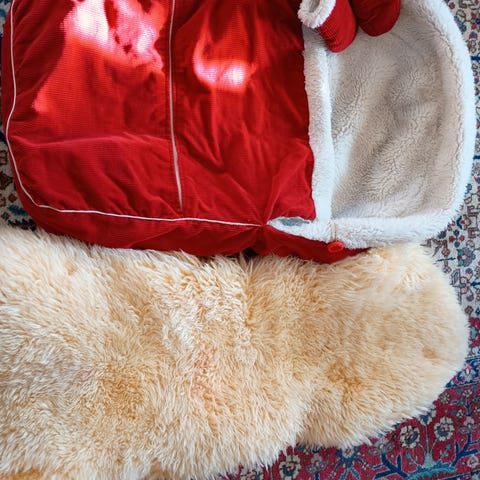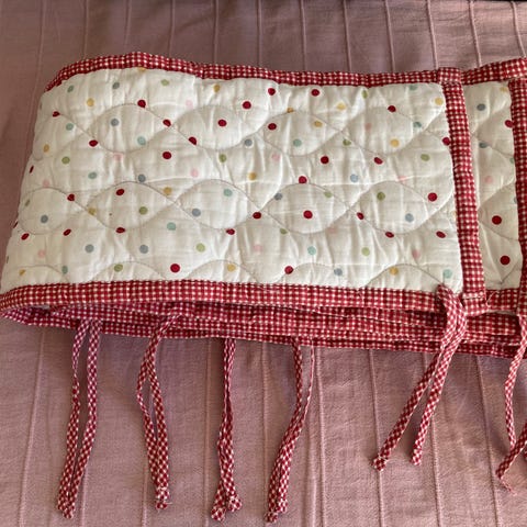 IKEA barnstol dyna i rödvit randig textil. Dynan är formad för att passa en barnstol och har flera fästen för att kunna knytas fast på stolen. Passar som extra sittkomfort och stöd för mindre barn i barnstol.