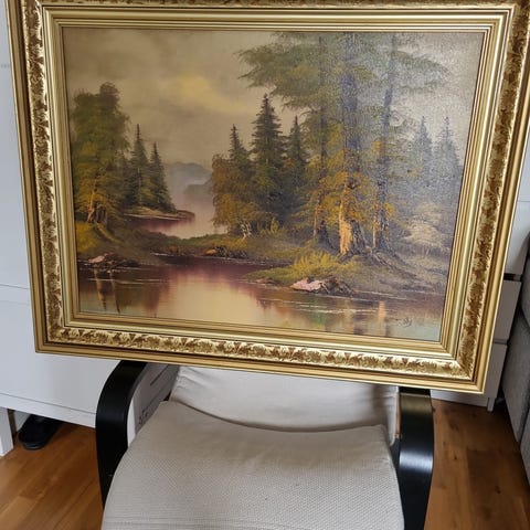 Mått inklusive ram 1,20 x 1,00. Tavellampa fastskruvad i övre ram. Inga övriga skador vad jag kan se.