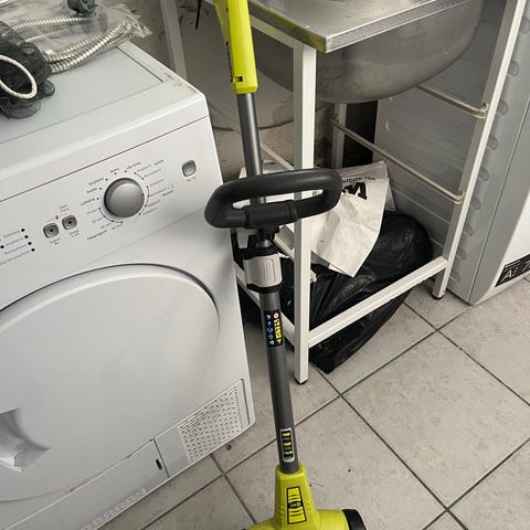 Ryobi högtryckstvätt för rengöring av exempelvis uteplatser, fordon och trädgårdsredskap. Modellen har tydlig frontpanel med effektlägen markerade och anslutningar för högtrycksslang och vattenintag framtill. Enheten är utrustad med bärhandtag och hjul för enklare förflyttning. Passar för användning runt hus och trädgård där högtryckstvätt behövs för mer effektiv rengöring än vanlig vattenslang.