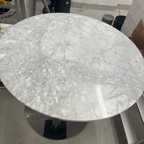 Runt matbord med marmormönstrad bordsskiva och underrede i metall. Bordsskivan har en ljus yta med mörkare ådring som ger ett marmorliknande utseende. Underredet består av en svart, fyrkantig metallstomme som ger stabilitet och ett modernt uttryck. Passar som matbord eller köksbord i mindre till medelstora rum.