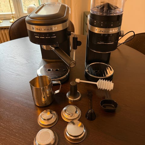 Magic Bullet mixer med basenhet och flera tillbehör. Setet inkluderar flera genomskinliga plastmuggar med färgade ringar, lock samt knivenhet. Produkten är avsedd för mixning av till exempel såser och enklare matberedning direkt i muggarna. Alla delar som syns på bilderna ingår.
