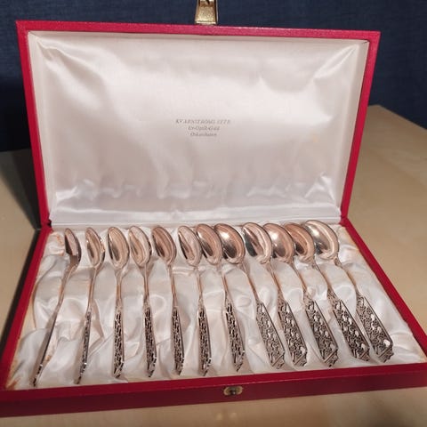 Bestickset i metall i fler delar för dukning. Setet innehåller olika typer av bestick såsom gafflar, knivar, matskedar, teskedar och serveringsbestick. Besticken har dekorerade handtag och levereras i ett mönstrat etui med plats för varje del. Lämpligt för vardagsbruk eller vid större måltider där ett komplett set behövs.