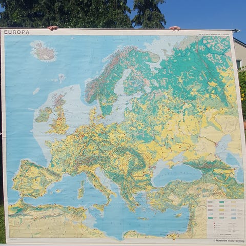 Stor världskarta som en gång i tiden förmodligen hängt i en skola.
