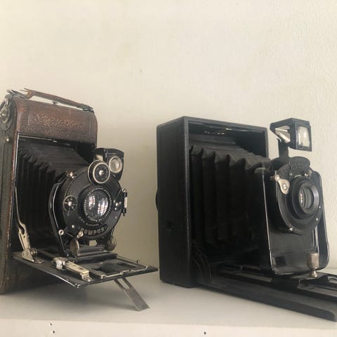 Flera äldre kameror av box- och bälgtyp syns på bilderna, lämpliga som samlarobjekt eller rekvisita. Exakta modeller och tekniska specifikationer framgår inte, men utrustningen består av analoga kameror i metall och läderliknande material.