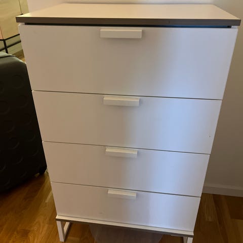 Säljer denna vita byrå med marmorerad träskiva. Hämtas i Vasastan, Stockholm.