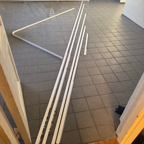 Helt nya. Gardinskenor i metall. Inkluderar diverse tillbehör som gardinkrokar och fästen för vägg. (Går att köpa tillbehör från Hemtex för att ha på tak med)