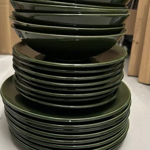 H&M Home tallriksset i grönt porslin. Setet består av flata tallrikar och djupa tallrikar i matchande färg. Sälj tillsammans:)