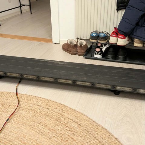 Takmonterad LED ljusramp för bil. Rampen är lågprofil och monterad på takräcke eller direkt på taket. Lämplig som extrabelysning eller varningsljus på fordon. Mått framgår delvis av bilden med måttband, vilket visar höjden över taket. Färg på rampens hus är mörk, med klara linser för LED-dioderna.