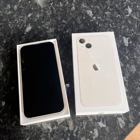 iPhone 13 med 128 GB lagringsutrymme som har några små skråmor längs kanten men annars i väldigt bra skick