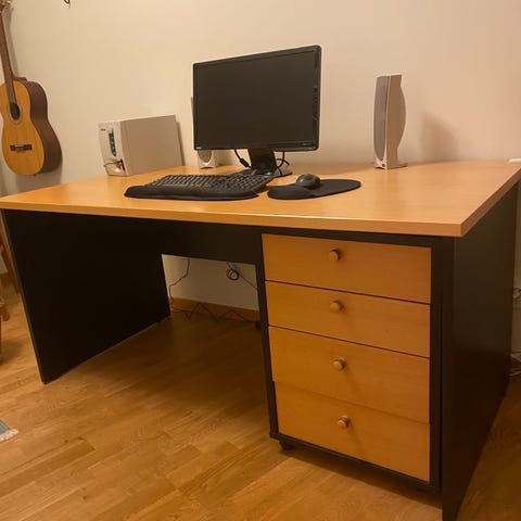 Säljer ett stabilt och stilrent skrivbord i mörkbrun ek. Perfekt som hemmakontor eller studiebord. Gott om förvaring och smart kabeldragning gör det både praktiskt och snyggt.