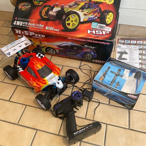 Fjärrstyrd leksaksbil med drakmotiv i röd och gul färg. Bilen har dekorativa detaljer som flammor och draktänder samt kromfärgade hjul. Medföljande handkontroll i rött och svart används för att styra bilen trådlöst. Lämplig som leksak för barn som gillar bilar och fantasitema som drakar. Laddas med USB kabel på undersidan.