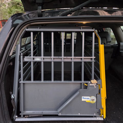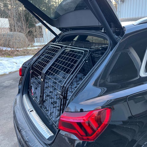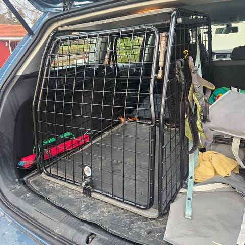 Rejäl och stor hundbur. Låsbar. Sitter i en V70 (fas 3). Passar säkert fler bilmodeller.