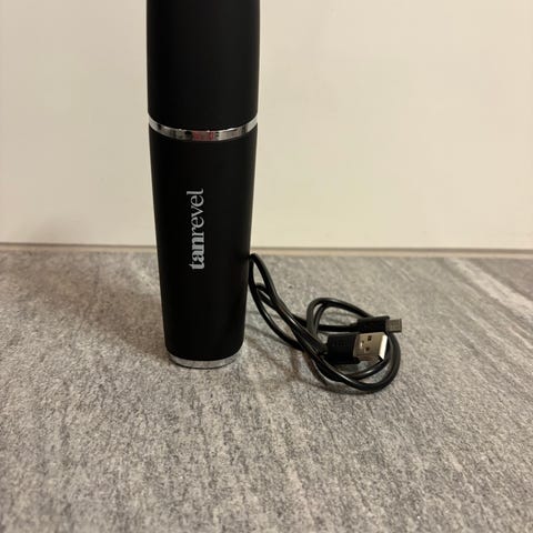 Tanrevel Pro brun utan sol-enhet i svart färg. Portabel enhet för applicering av brun utan sol-produkt i ansiktet eller på kroppen. Levereras med USB-laddkabel, instruktionshäfte och förvaringsask. Enheten är uppladdningsbar och avsedd för hemmabruk för att ge en jämn applicering av brun utan sol-vätska.