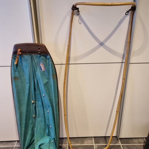 Segnaden-Berg pulka i trä med rött kapell. Pulkan har träribbor undertill förstärkta med metallister. Kapellet är i textil och fästs runt pulkan för att skydda packning eller passagerare. Lämplig för vinterbruk och transport av packning eller barn på snö. Skaklar samt selar medföljer till medelstor hund samt även till dragande person.