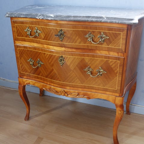 Väggspegel med dekorativ smidesram och rektangulär spegelyta. Spegeln är monterad ovanför en liten konsol med marmorskiva och smidesunderrede. På sidorna om spegeln finns två vägglampetter med lampskärmar. Passar exempelvis i hall eller sovrum som kombinerad spegel och avställningsyta.