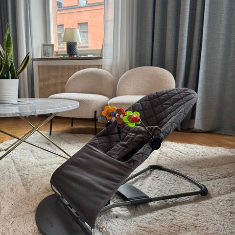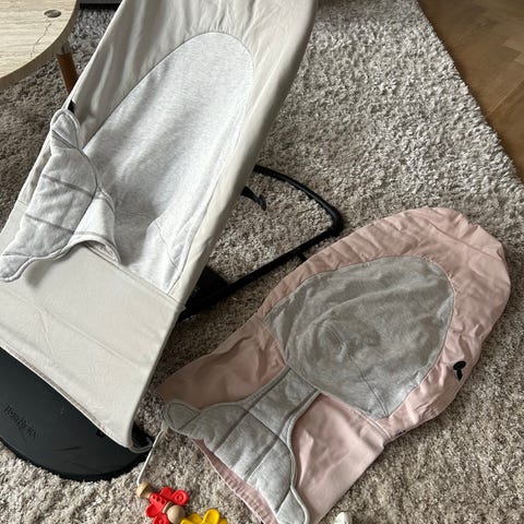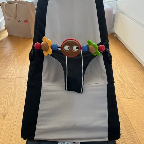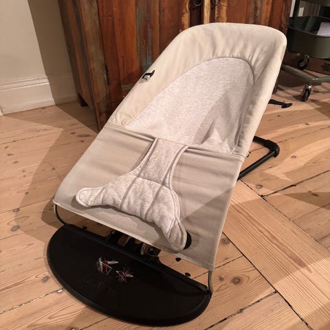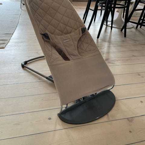 Babybjörn babysitter barnstol i beige färg. Klädseln har quiltat mönster och är försedd med justerbart säkerhetsbälte. Stativ i metall med plastfot. Passar som sitt- och vilostol för spädbarn och småbarn.