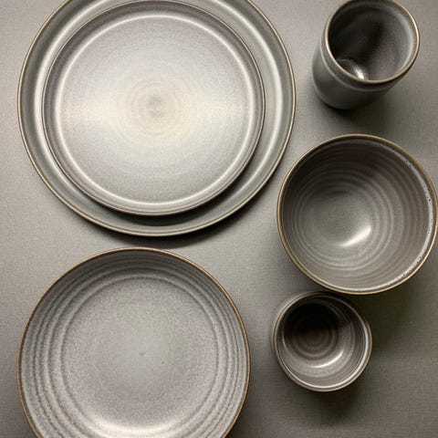 Rusta tallrikar i blå keramik med mönstrad yta. Setet består av flera tallrikar i olika storlekar, lämpliga som mattallrikar och assietter. Rund form med dekorativ struktur på ovansidan och slät undersida. Passar för servering av vardagsmat och enklare dukningar i hemmet.