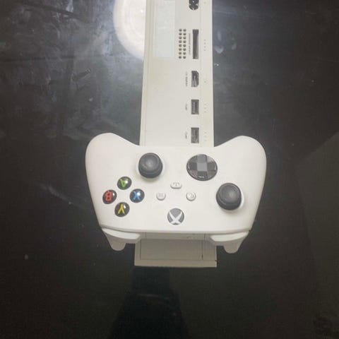 Microsoft Xbox Series S spelkonsol i vit färg. Konsolen är en digital modell i Xbox Series-familjen och ansluts med HDMI till TV eller skärm. På baksidan finns anslutningar för ström, HDMI, nätverk och USB. I annonsen ingår en vit trådlös Xbox-handkontroll samt en extra handkontroll med dekorativt mönster. Systemet är avsett för spel, streaming och andra underhållningsappar som stöds av Xbox Series-plattformen.