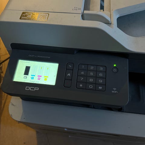 Multifunktionsskrivare med integrerad dokumentmatare och färgpekskärm på framsidan. Enheten är avsedd för kontors- eller hemmabruk och kan användas för utskrift, kopiering och skanning. Skrivaren har en övre skanningsdel med lock och en nedre utskriftsdel. Pekskärmen visar olika funktionsval och inställningar. Lämplig för användare som behöver en kombinerad skrivare, kopiator och skanner i ett kompakt format.
