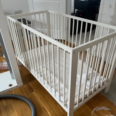 Spjälsäng Gulliver och medföljande madrass Skänast. Använda av två små barn. Madrassen är i ny skick då alltid använts madrasskydd. Bilderna representerar sängens skick väl. För mee info, titta gärna på produkterna på Ikeas webbsida. Finns I Järvastaden.