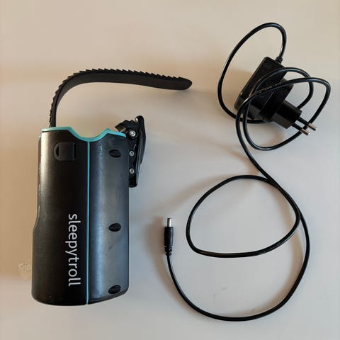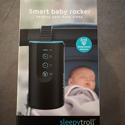 Sleepytroll Baby Rocker med sängadapter är en elektrisk vaggare för spädbarn. Enheten fästs på säng eller spjälsäng med medföljande adapter och kan hjälpa till att vagga barnet genom motoriserade rörelser. På framsidan finns knappar för att starta och stoppa vaggrörelsen samt justera intensitet. Produkten har inbyggda sensorer (Sleepwatch sensors) som registrerar rörelser eller ljud och kan aktivera vaggrörelsen automatiskt. Färg: svart med turkosa detaljer. Avsedd för användning med barnvagn eller spjälsäng enligt tillverkarens instruktioner.