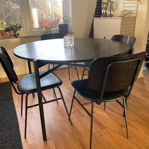 Snyggt och stabilt bord som rymmer många men ger ett nätt intryck. Lättskött, går lätt att torka av och håller smuts och fläckar borta.