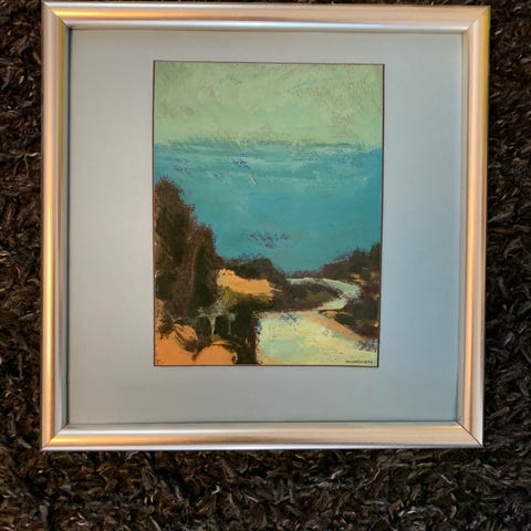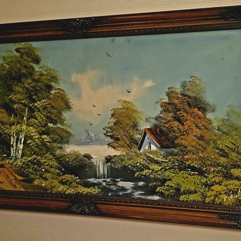 Tavla med motiv av ett vattenfall i en grön skog. Målningen är gjord i starka färger med blått vatten, gröna träd och klippor i förgrunden. Tavlan är inramad i en enkel träram med glas eller plastfront. Passar som väggdekoration i exempelvis vardagsrum, sovrum eller hall.