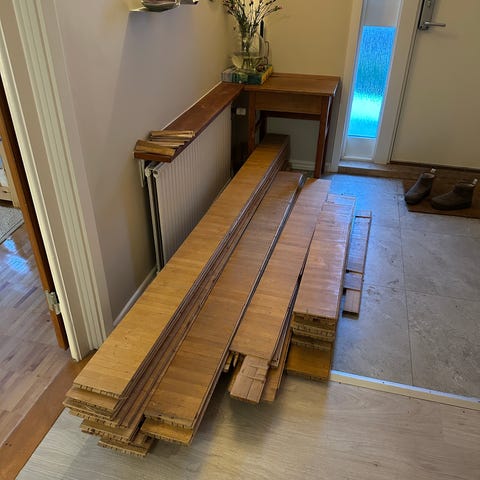 Parkettgolv i stavparkett med ljusbrun träyta. Golvet består av smala trästavar lagda i ett regelbundet mönster. Passar för inomhusbruk i bostad eller lokal där man önskar ett klassiskt trägolv. Golvet kan vid behov slipas och behandlas enligt gängse metoder för trägolv, beroende på skick och önskat utseende.