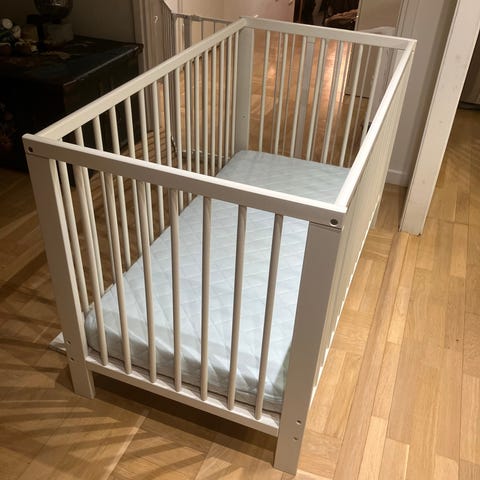 Jag säljer en Gulliver spjälsäng från Ikea med madrass. Ena sidan kan tas bort så att barnet kan klättra i själv. Perfekt skick. Jag har även madrassöverdrag, sängkläder, kläder, leksaker och många andra babyartiklar.