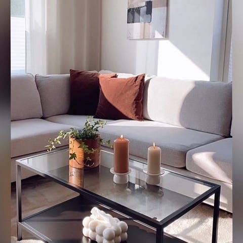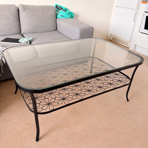 Soffbord med skiva i glas och stomme i svart metall. Bordet består av två separata delar som kan stå ihop eller isär. Den ena delen har en extra hylla undertill för förvaring av till exempel tidningar eller böcker. Passar som vardagsrumsbord framför soffa eller fåtölj.