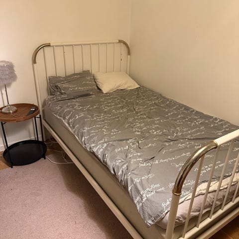 Aldrig använd Jysk säng med madrass i svart metallram. En enkelsäng med ribbad gavel i metall och ben i samma material. Madrassen är vit och anpassad för sängramen. Passar som enkelsäng i sovrum, gästrum eller studentrum. 90cm